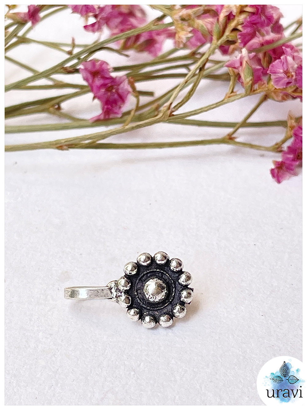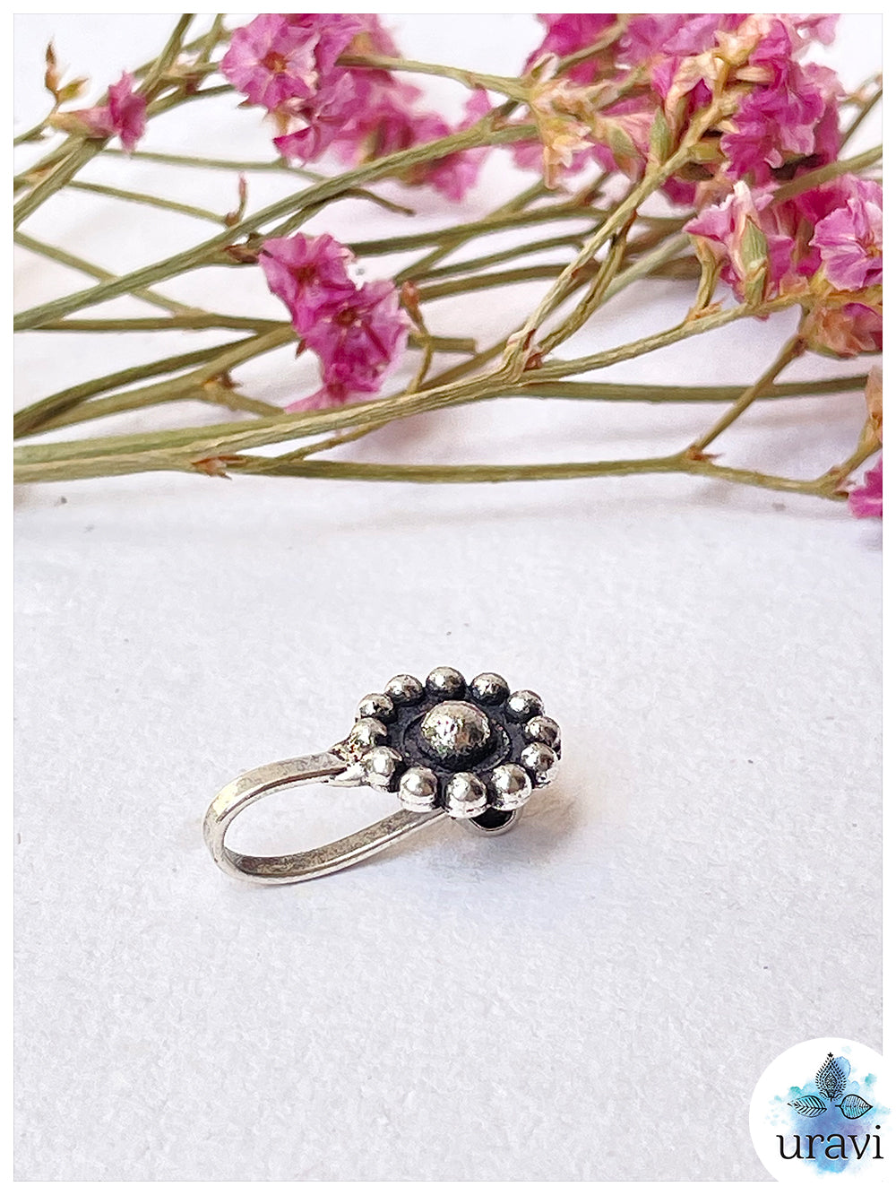 Introducing "Chandramukhi" – a stunning non-piercing nose pin designed to enhance your ethnic beauty with its timeless elegance. This oxidized silver replica nose cuff features a beautifully intricate floral pattern, capturing the essence of traditional artistry in a contemporary design. Crafted from durable brass with an oxidized silver look-alike polish, "Chandramukhi" offers both longevity and a captivating shine. The free-size design ensures a comfortable and secure fit, making it easy to add a touch of grace to your ethnic ensemble without the need for piercing. Elevate your traditional look with the "Chandramukhi" nose pin, perfect for any special occasion or everyday wear.