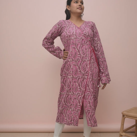 A celebration of Rajasthani craft tradition, this kurta is hand-printed using the centuries-old Dabu mud-resist technique, known for its earthy tones and bold natural motifs. The dusty rose base is brought to life with abstract white floral vines, creating a look that is both delicate and bold. Designed in a relaxed Angrakha silhouette, the piece wraps across the body and ties at the side with shell-accented cords, balancing traditional charm with modern wearability.