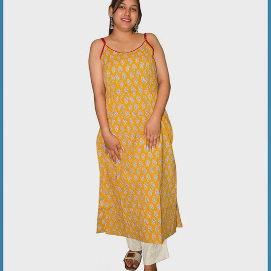 Radiant and easy-breezy, Kumudini captures the joyful essence of Sanganer’s floral prints in a sunlit mustard palette. Printed using the screen-print technique inspired by traditional hand-block motifs, this kurta offers both precision and artistry. The sleeveless strappy silhouette with red piping adds a youthful twist, while the soft cotton drape keeps it effortlessly breathable. Pair it with linen trousers or wear it solo — Kumudini is sunshine, simplicity, and craft in one frame.