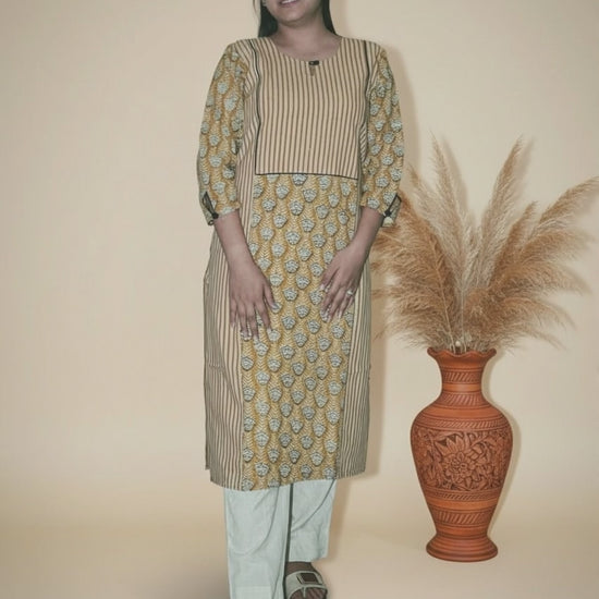 The Pranaya kurta beautifully unites two Sanganeri traditions — delicate floral butis and heritage-inspired stripes — in an elegant ochre and beige palette. Crafted in soft cotton and printed with pigment colors by skilled artisans, it features a striking panelled layout that flatters every silhouette. Thoughtful details like a keyhole neckline, contrast piping, and buttoned cuffs make it a perfect blend of tradition and quiet sophistication. Designed for comfort and grace, Pranaya brings timeless craft into your everyday wardrobe.