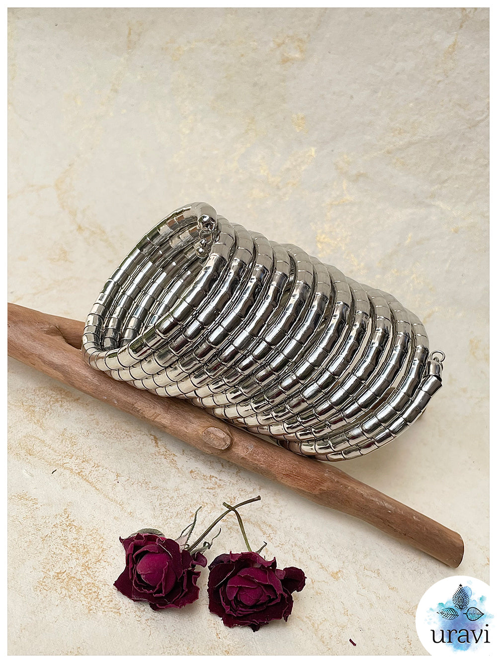 Introducing SpiralCreeper — where modern design meets timeless allure. Crafted from durable brass metal, this striking bangle is shaped as a flexible spiral wire that winds gracefully around your wrist, creating a bold statement of elegance and movement. The sleek metallic sheen and sculptural silhouette make it a versatile piece that transitions effortlessly from day to night. With its innovative free-size fit, SpiralCreeper adapts comfortably to every wrist — offering style, strength, and sophistication in one fluid design.
