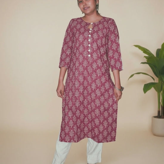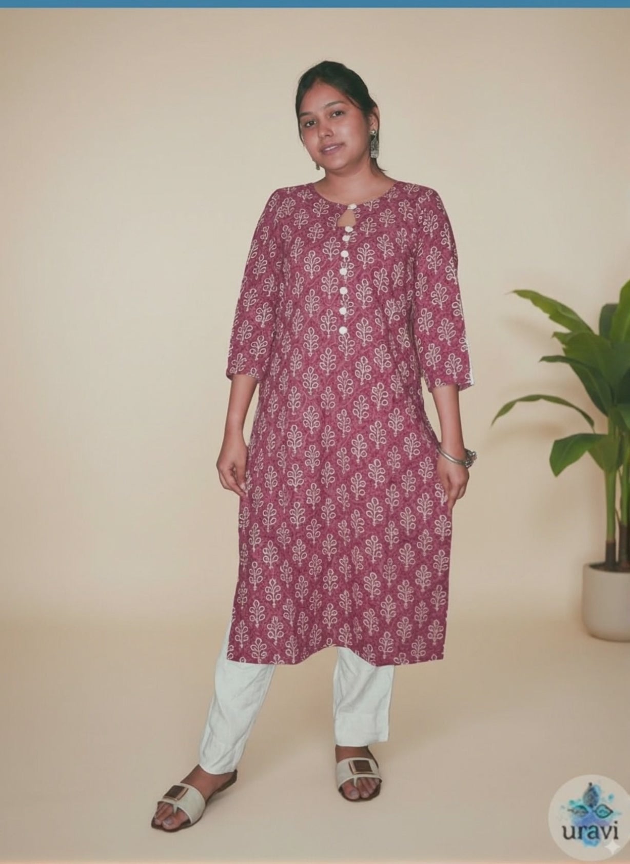Rooted in the soul of Rajasthan, Vasundhara celebrates the age-old Dabu mud-resist printing tradition — where earth, dye, and artisan hands come together in perfect rhythm. Crafted in a serene rose tone, this hand-block printed kurta features delicate vine motifs in ivory, symbolizing growth and grace. The handcrafted cloth buttons, soft cotton drape, and a thoughtfully placed side pocket lend it everyday ease. Timeless and breathable, Vasundhara embodies Uravi’s philosophy — heritage reimagined for the modern woman.