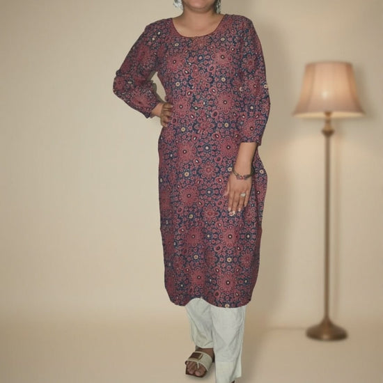 The Sharvangi kurta celebrates the timeless artistry of Sanganer — where hand-carved wooden blocks meet centuries-old dyeing traditions. Crafted in pure cotton, this kurta features intricate floral-mandala motifs printed in earthy tones of indigo and rust. Its gently gathered sleeves with buttoned cuffs and classic straight silhouette bring a refined elegance to the traditional craft. Effortlessly versatile, Sharvangi is designed for women who appreciate comfort rooted in culture.